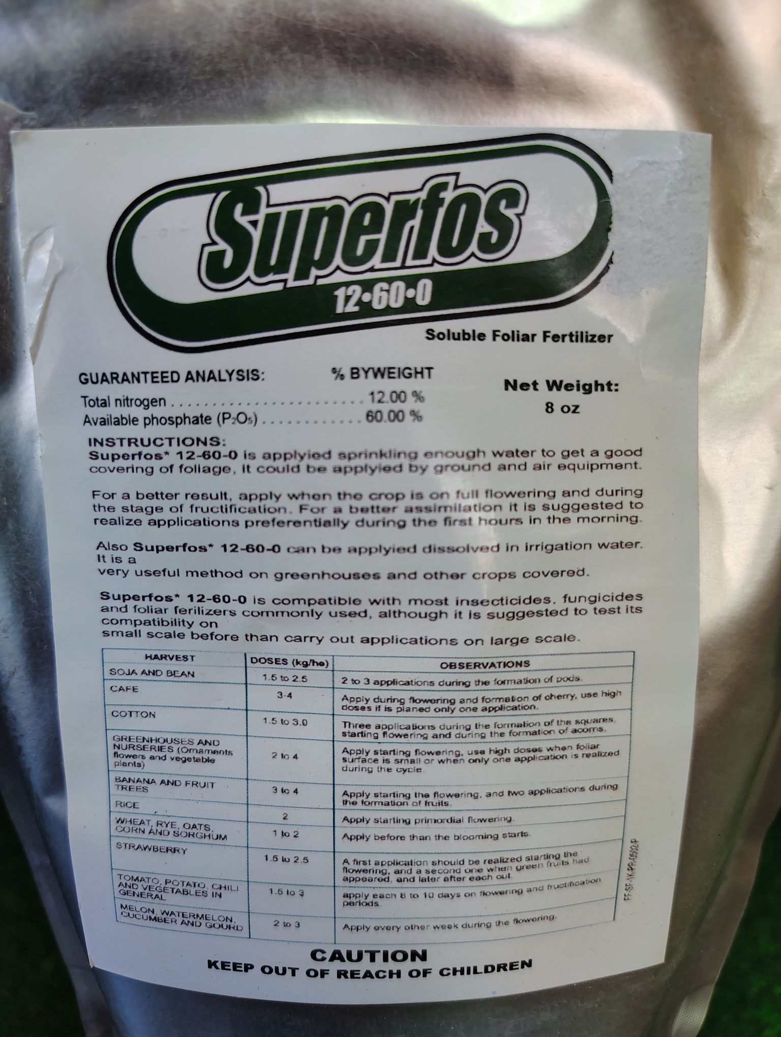 Superfos es un fertilizante foliar en cristales altamente solubles, formulado con una alta concentración de fósforo (60 % P₂O₅) y nitrógeno total 12 % para ayudar a las plantas a superar deficiencias durante etapas clave como floración y formación de frutos y semillas. Se aplica por aspersión en suficiente volumen de agua para cubrir de forma uniforme el follaje, y puede utilizarse con equipos de aplicación terrestre o aéreo.